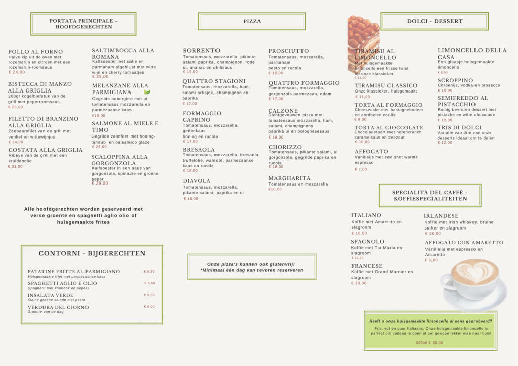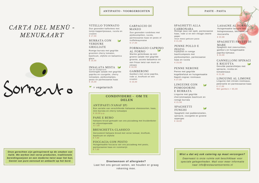 Restaurant Sorrento is een sfeervol restaurant nabij het centrum van Lelystad. U kunt bij Sorrento genieten van heerlijke Italiaanse gerechten. Daarnaast kunt u ook online bestellen dan bezorgen wij de gerechten bij u thuis.